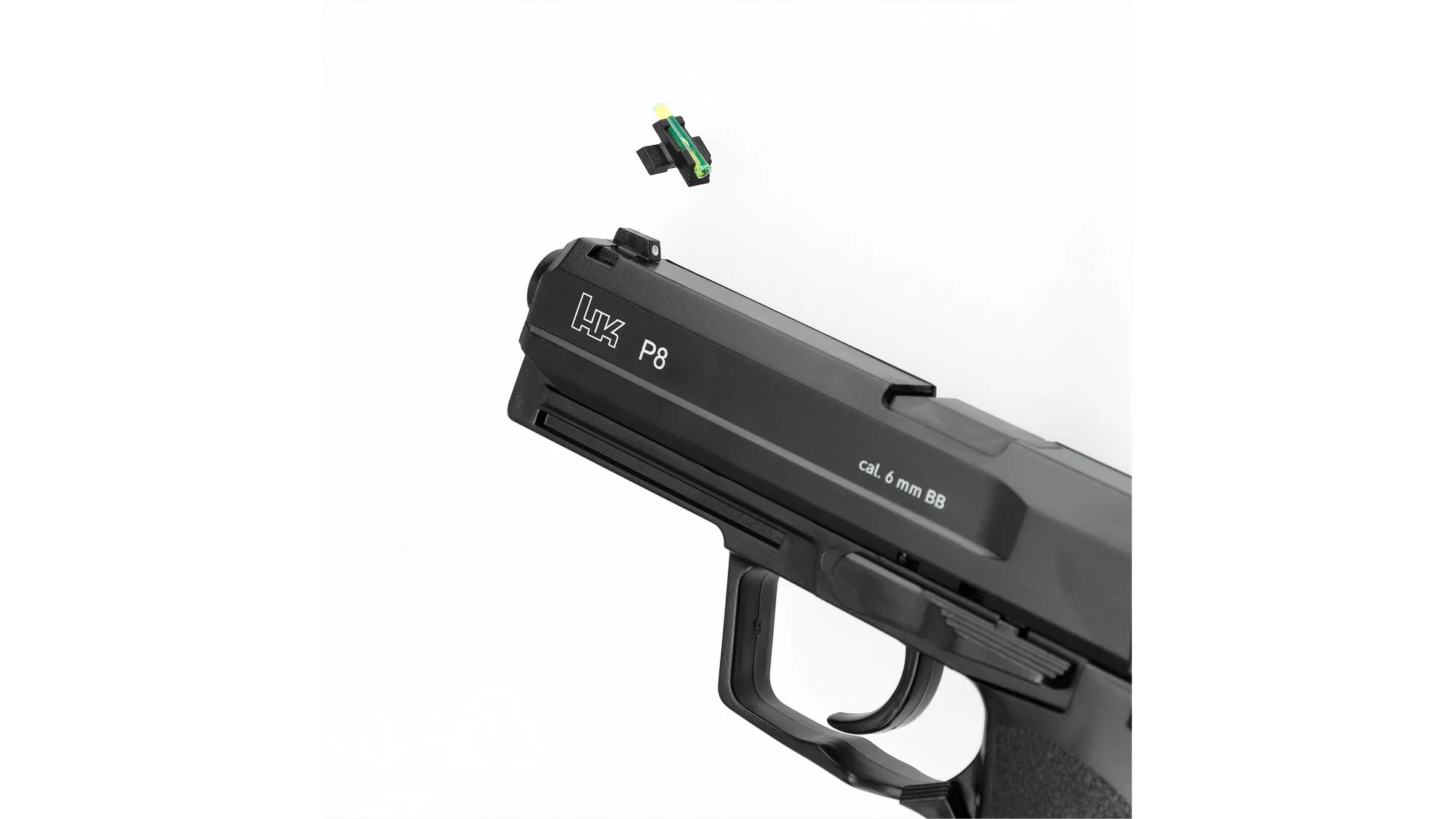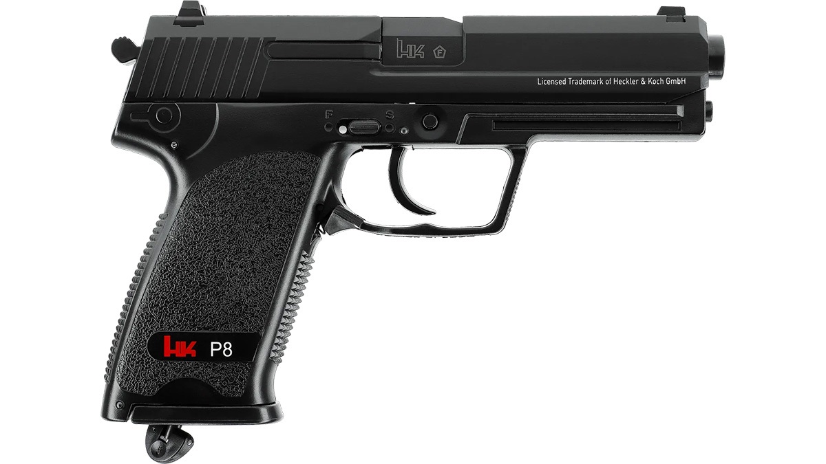 Heckler & Koch P8 är en realistisk airsoftpistol avsedd för 6mm ammunition. Pistolen drivs på 12grams kolsyrepatron som sitter integrerad i magasinet. Tack vare att den är kolsyredriven så händer det grejer när man trycker på avtryckaren, det är bara att sikta och trycka av. Magasinspärr sitter vid varbygeln för att snabbt och smidigt kunna få ut magasinet. Magasinet rymmer 17st plastkulor. Det främre kornet går att byta ut till fiberoptiskt korn. Manuell säkring. Picatinny skena finns framtill under pipan för möjlighet att montera exempelvis lasersikte eller ficklampa. Pistolen har en anslagsenergi upp till 2J och har en hög utgångshastighet, minst 20m säkerhetsavstånd rekommenderas vid spel. Ett tips om man inte har haft CO2-drivna vapen tidigare är att man köper med en liten tub Pellgun oil – här sätter man bara en droppe olja på typ var 5 – 6 CO2-patron så håller packningen som stöter mod CO2-patronen sig i bra skick. Skyddsglasögon rekommenderas alltid att man använder. För inköp av alla typer av luft och airsoft vapen gäller 18-års åldersgräns.