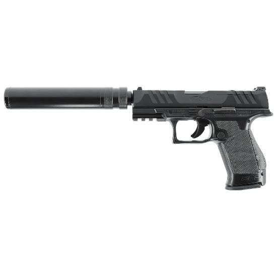 Walther PDP Compact 4″ med ”ljuddämpare”. Mycket populär airsoftpistol i häftig design. ”Ljuddämparen” går att gänga av så pistolen kan även användas utan den. Modellen är avsedd för airsoftammunition 6,0 mm i viktklasserna 0.12 eller 0.20g. Det ingår både ett 13 skotts magasin och ett HiCap magasin med reserv utrymme för över 100 skott. Pistolen är enkel att använda, dra bak manteln och spänn upp fjädern, sikte och skjut. Modellen är ju fjäderdriven så mantelrörelse krävs mellan varje skott. Weaverfäste under pipan så du kan bestycka pistolen med lasersikte eller ficklampa om du vill.