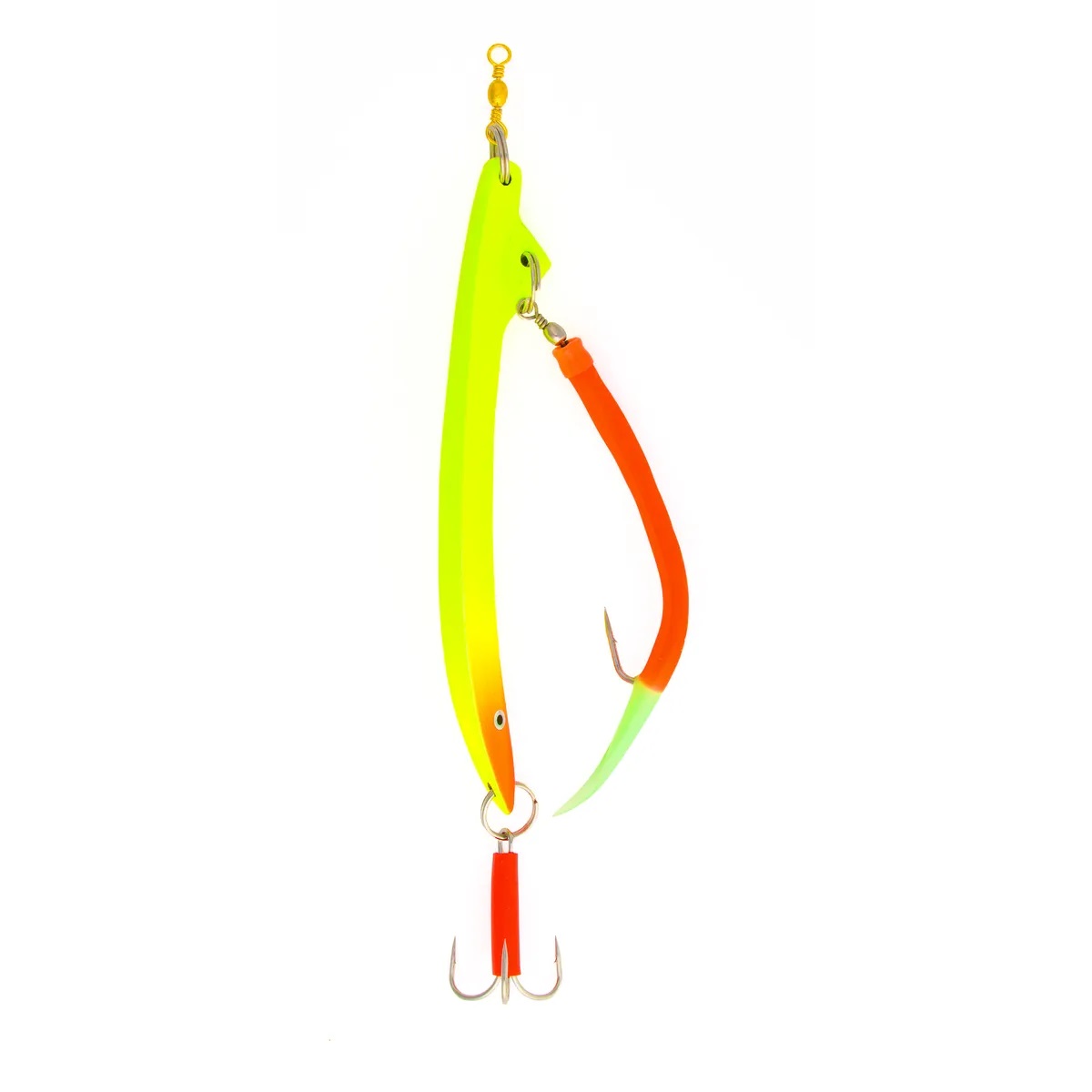 Här har vi en ny het pilk från Fladen Fishing med en klassisk och beprövad design. Pilken är förstärkt med en gummi Mac för att skapa lite extra rörelse och egga fisken till hugg. Pilken fungerar perfekt till torsk, kolja och snarlika fisksorter. Den böjda ”bananformen” ger pilken en lockande, wobblande rörelse på vägen ner. Fungerar utmärkt i strömmande vatten och lite större djup där vikt och rörelse är hemligheten för att få fina fångster. Banan pilkarna finns i en hel serie i olika färger och vikter från 200 – 500g.