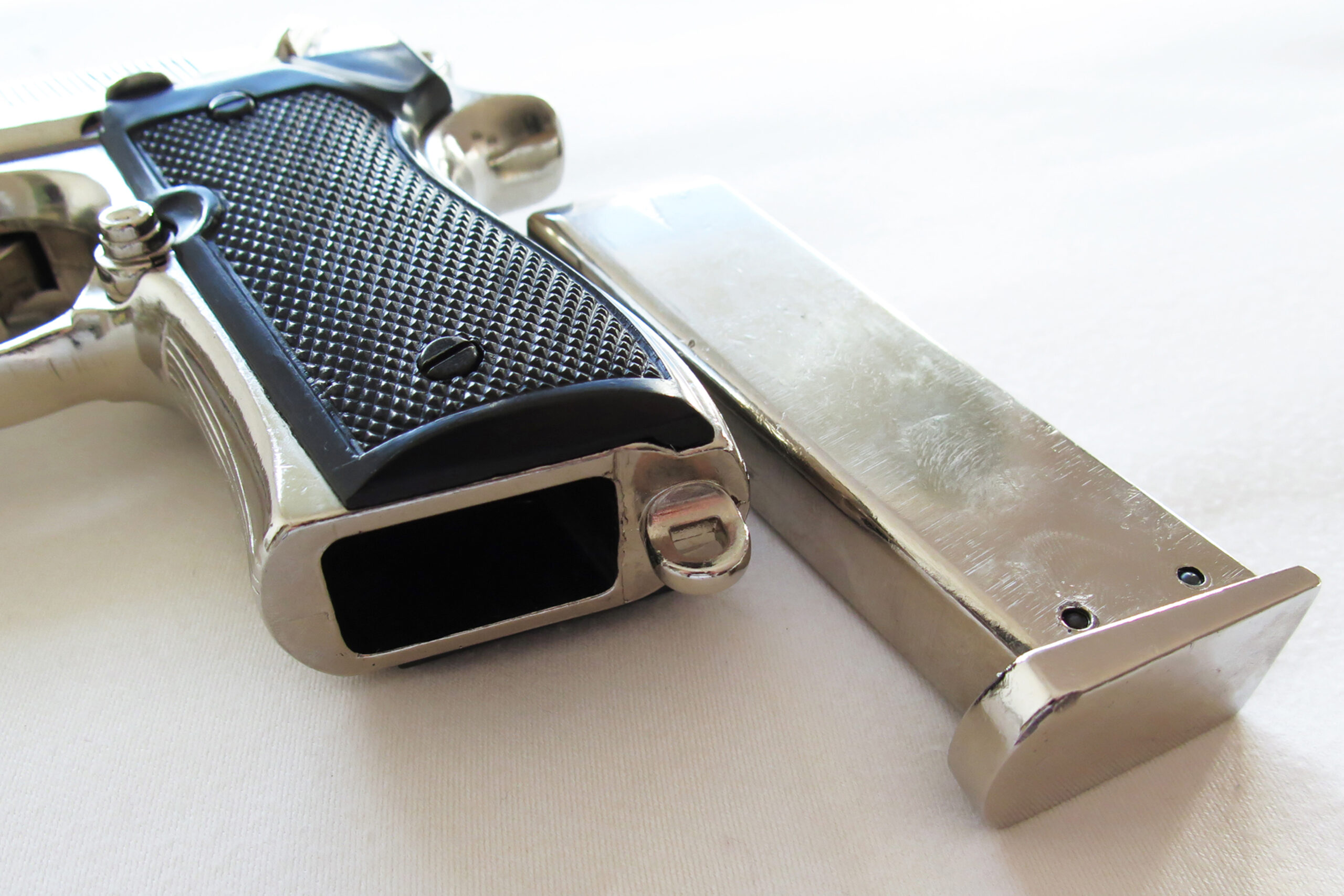 Replika pistol av välkända Italiensk pistol 92F – här i ”förnicklad” version.