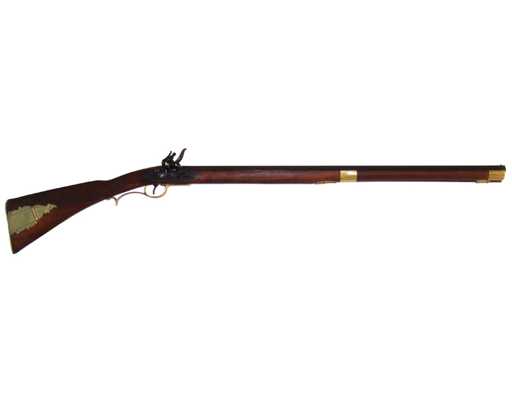 Replika av det välkända Kentucky geväret (USA), 1800-tal. Ursprungligen utvecklades Kentuckygeväret i Pennslylvania i början av 1700-talet och användes vanligtvis till jakt och tack vare att det exponerades mycket med äventyrare som Daniel Boone och Davy Crockett blev det lite av en symbol för denna tidsepoken i USA. Flintlåsgevären hade en bit flintsten som när du tryckte på avtryckaren skapade en gnista som antände krutet. Modellen krävde manuell omladdning mellan varje skott. Vapnet mynningsladdades först med krut, därefter kulan och sedan ”pappers vadd” vars huvuduppgift var att hålla kulan och krutet på plats. Mycket fin modell med trästock och fungerande mekanisk. På denna replikan kan du spänna upp hanen och fyra av. En replika med mycket historiska inslag som definitivt ska finnas med i samlingen om man är intresserad av denna tidsepok!