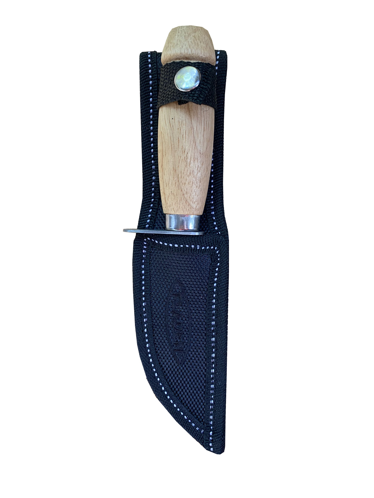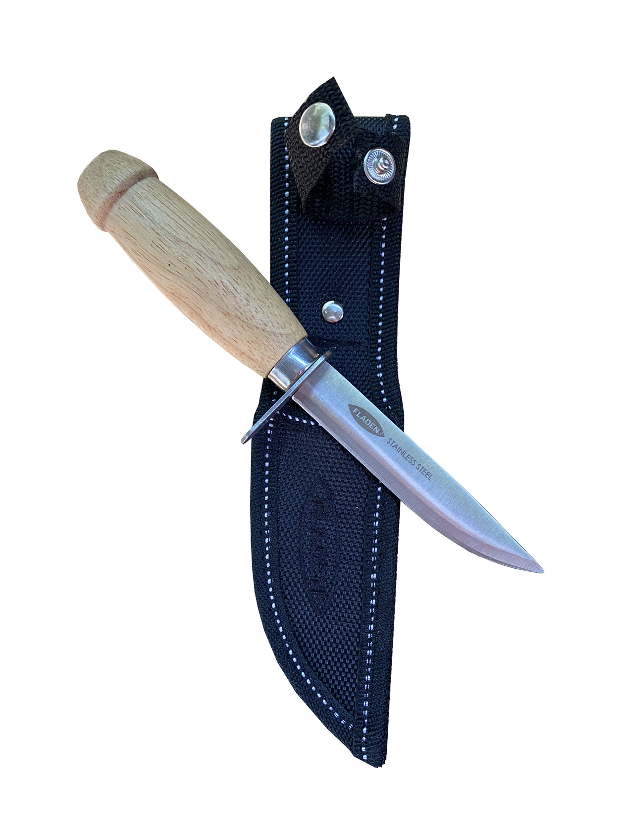 Scoutkniv – Friluftskniv – perfekt även som t.ex, ”1:a kniv” tack vare sitt robusta parerskydd. Välpolerat trähandtag. Kniven är rostfri med en längd om totalt 20cm. Levereras med slida försedd med bältesfäste och låsband till kniven. Scoutkniven är framtagen av Fladen Fishing och deras outdoor avdelning. Mycket prisvärd! Vem kommer inte ihåg sin första kniv?