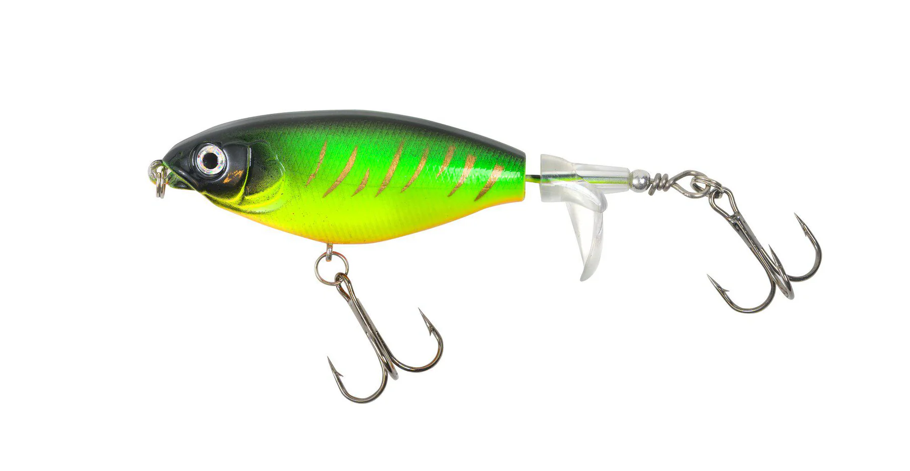 Designat för att snurra och skapa en lockande plaskande och ploppande effekt på vattenytan, får detta bete sin mest högljudda och effektiva aktion när du vevar in med spötoppen högt. Perfekt för dig som vill ha explosiva hugg på ytan – ett måste i varje fiskelåda! Vikt: 5g Längd: 8cm